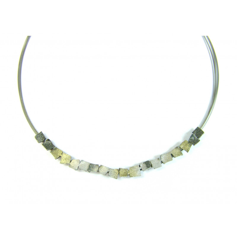 Gargantilla mosaico horizontal en plata de ley 925, óxido y pigmentos naturales metálicos en varios colores. Compuesto por 18 cuadrados pequeños irregulares formando pieza alargada 11,5 cm, óxido con pigmento, disponible en varios colores, con collar acero 3 hilos de 42 cm y cadena 2,5cm en plata 925.