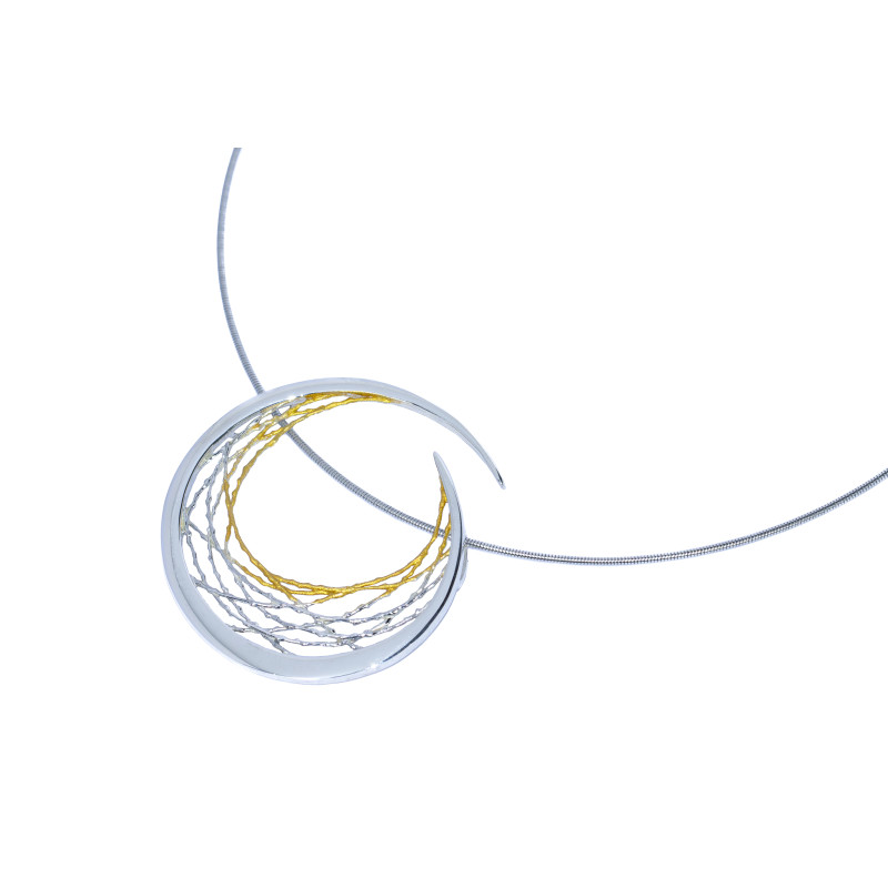 Colgante en plata de ley 925, disponible en acabados plata brillo, plata con baño oro y en plata óxido con pigmentos naturales en varias tonalidades.Compuesto por pieza circular recordando un campo de semillas en su interior de 4,4 cm x 4,2 cm disponible en acabados plata brillo, plata con baño oro y en plata óxido con pigmentos naturales en varias tonalidades con collar de acero muelle de 1,1 mm 1 hilo de 40,5 cm terminales en plata 925.