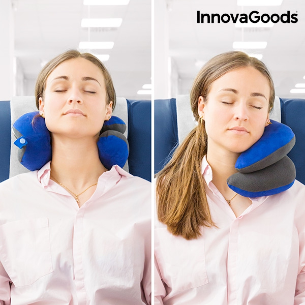 Duerme tranquilo y cómodo si te vas de viaje gracias a la nueva y práctica almohada cervical con soporte para barbilla. Se acopla al cuello para que puedas dormir relajadamente en varias posturas.