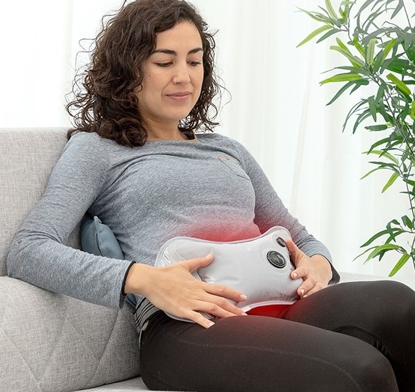 Una bolsa de agua caliente eléctrica recargable con correa ajustable para poder usarla cómodamente en cualquier parte del cuerpo