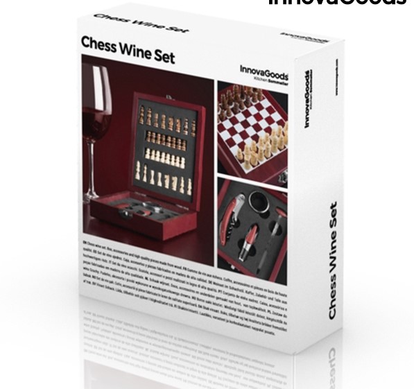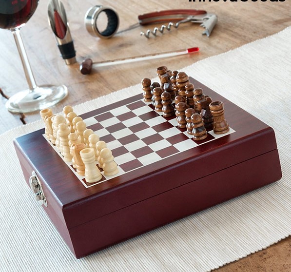 Ideal para fiestas y celebraciones, ya que es un juego de ajedrez y a la vez un completo set de accesorios para vino.